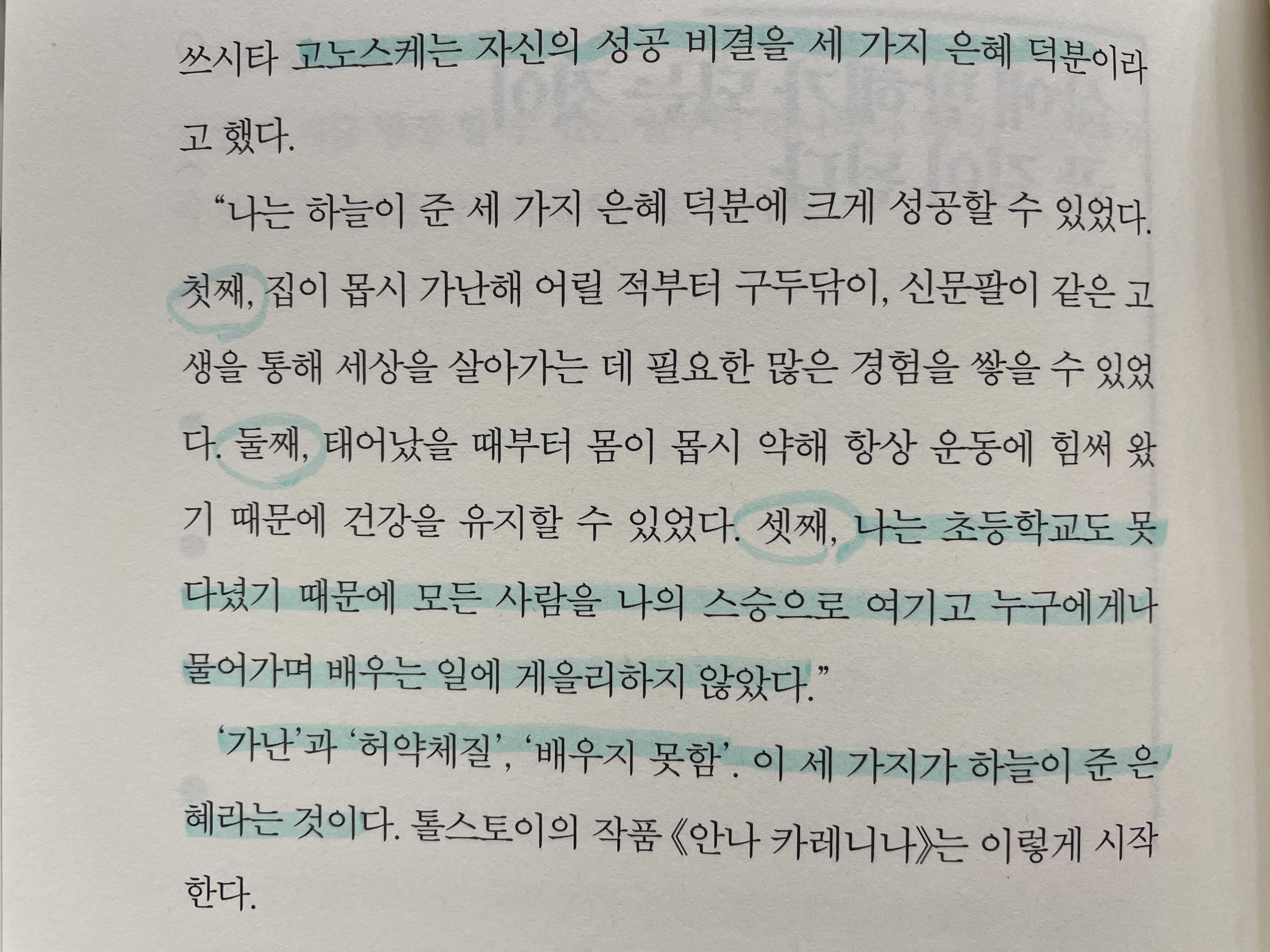 여러번 보고 싶은 책을 또 한 권 찾았다. 읽은지 얼마 안되서 두 번째 읽고 있는데 명확한 문장이 너무 마음에 든다. 오늘은 "마쓰시타 고노스케"의 성공의 세 가지 은혜와 "정이"의 인간의 세 가지 불행에 대해 소개하려고 한다.